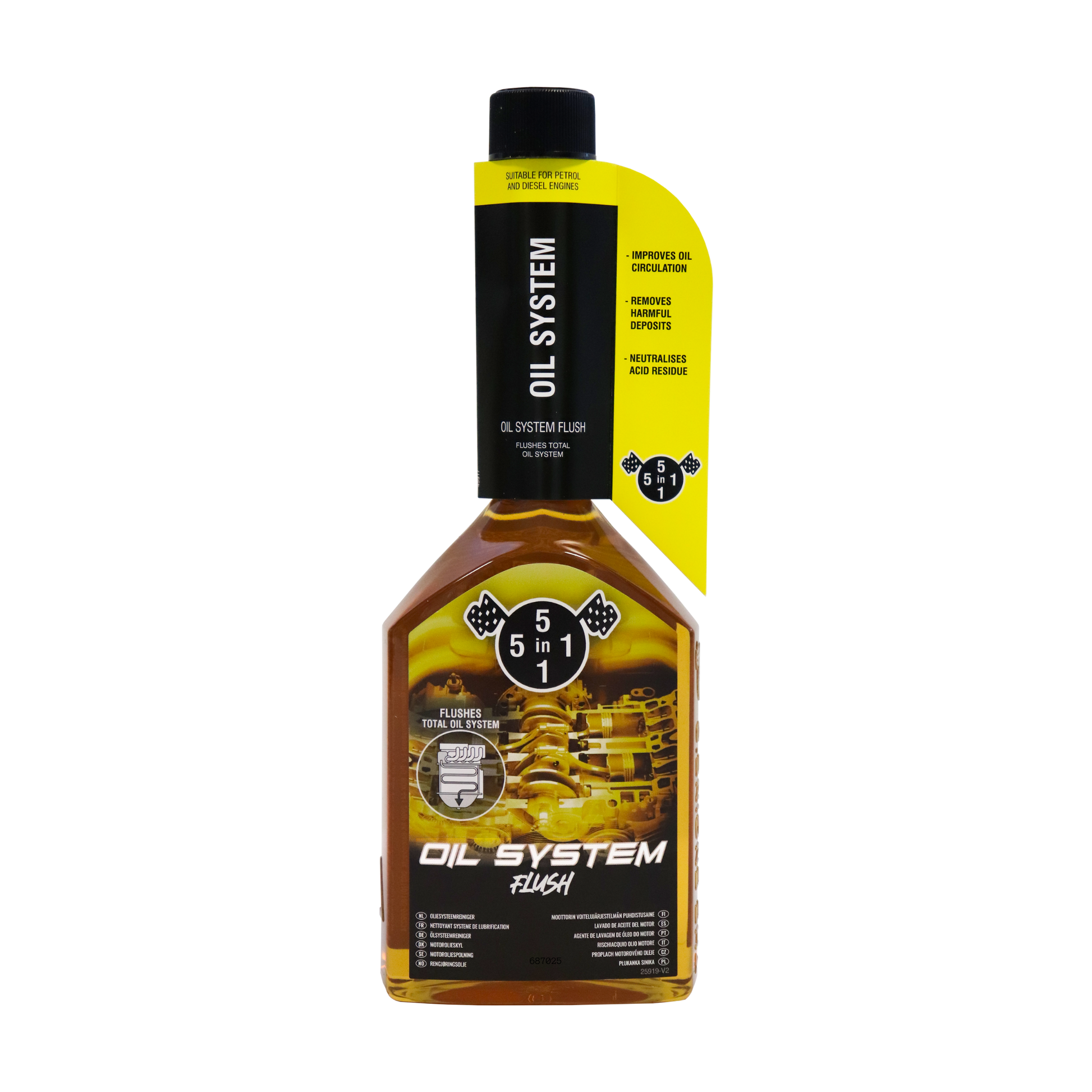De 5in1 oliesysteem reiniger is een zeer gemakkelijk product om het motorolie systeem mee te reinigen. Het product zorgt ervoor dat de nieuwe olie niet meteen vervuild is doordat er vuildeeltjes achterblijven van de oude olie. De oliereiniger voeg je eenvoudig toe aan de oude gebruikte olie. De oliesysteem reiniger wordt opgelost in de oude olie, waarna alle vervuilingen vervolgens loslaten. Het toevoegen van de 5in1 oliereiniger aan de olie verwijdert vuil, helpt om zuren te neutraliseren en absorbeert lak. Deze oliereiniger is geschikt voor benzine en diesel motoren. Dit product reinigt het complete motorsysteem.