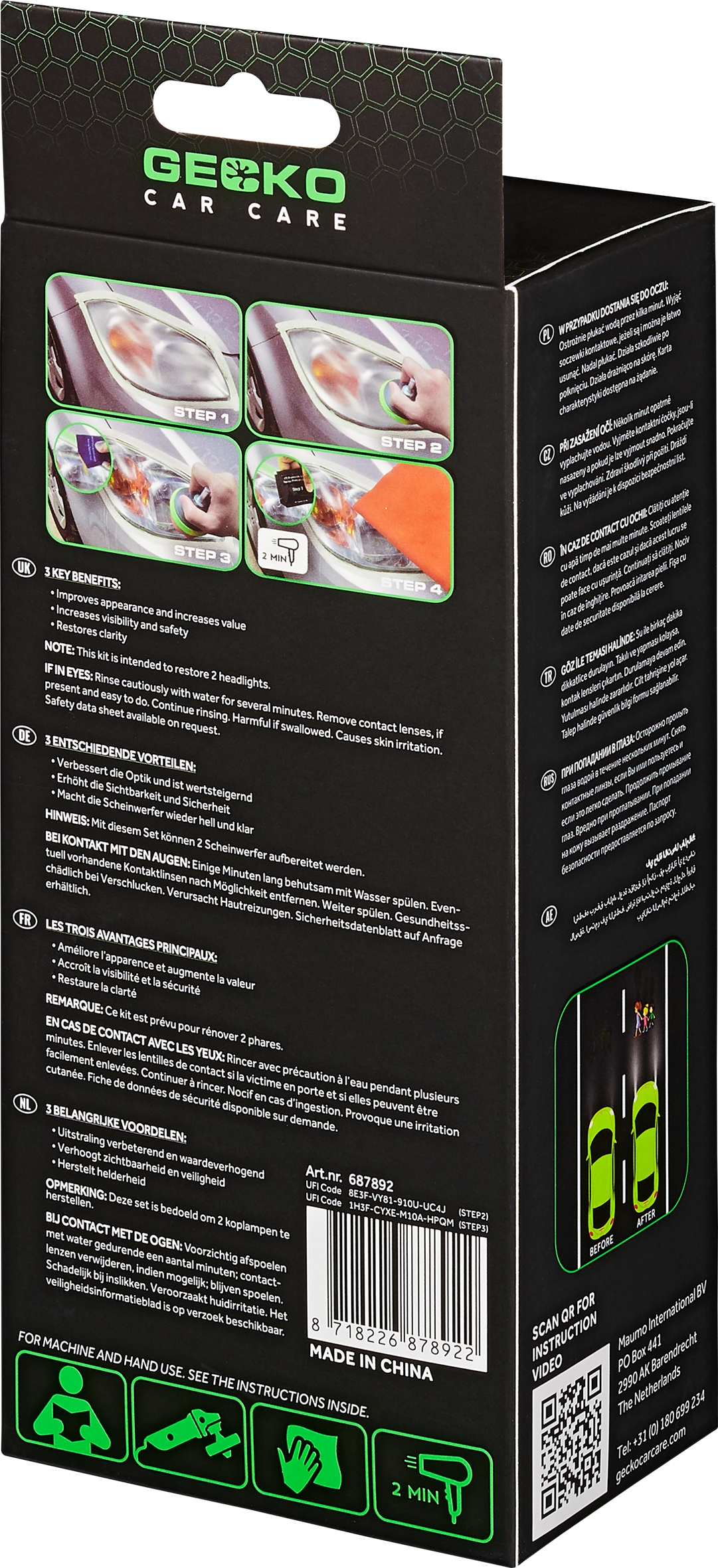 De Gecko Koplampherstelset is ontworpen om ernstige aanstasting van koplampen, zoals vergeling, oxidatie en krassen te verhelpen. De set bevat alles wat u nodig heeft om zelfs de meest doffe koplamplens te herstellen. De beste resultaten worden verkregen bij kunststofoppervlakken zoals achter- en aanhangerverlichting, bootramen, helmvizieren, windschermen voor motoren en sneeuwmobielen, etc.