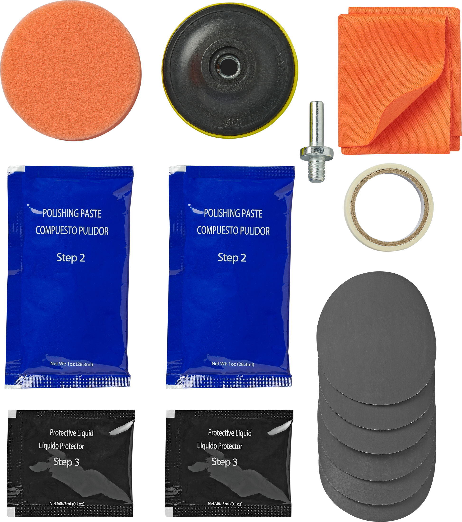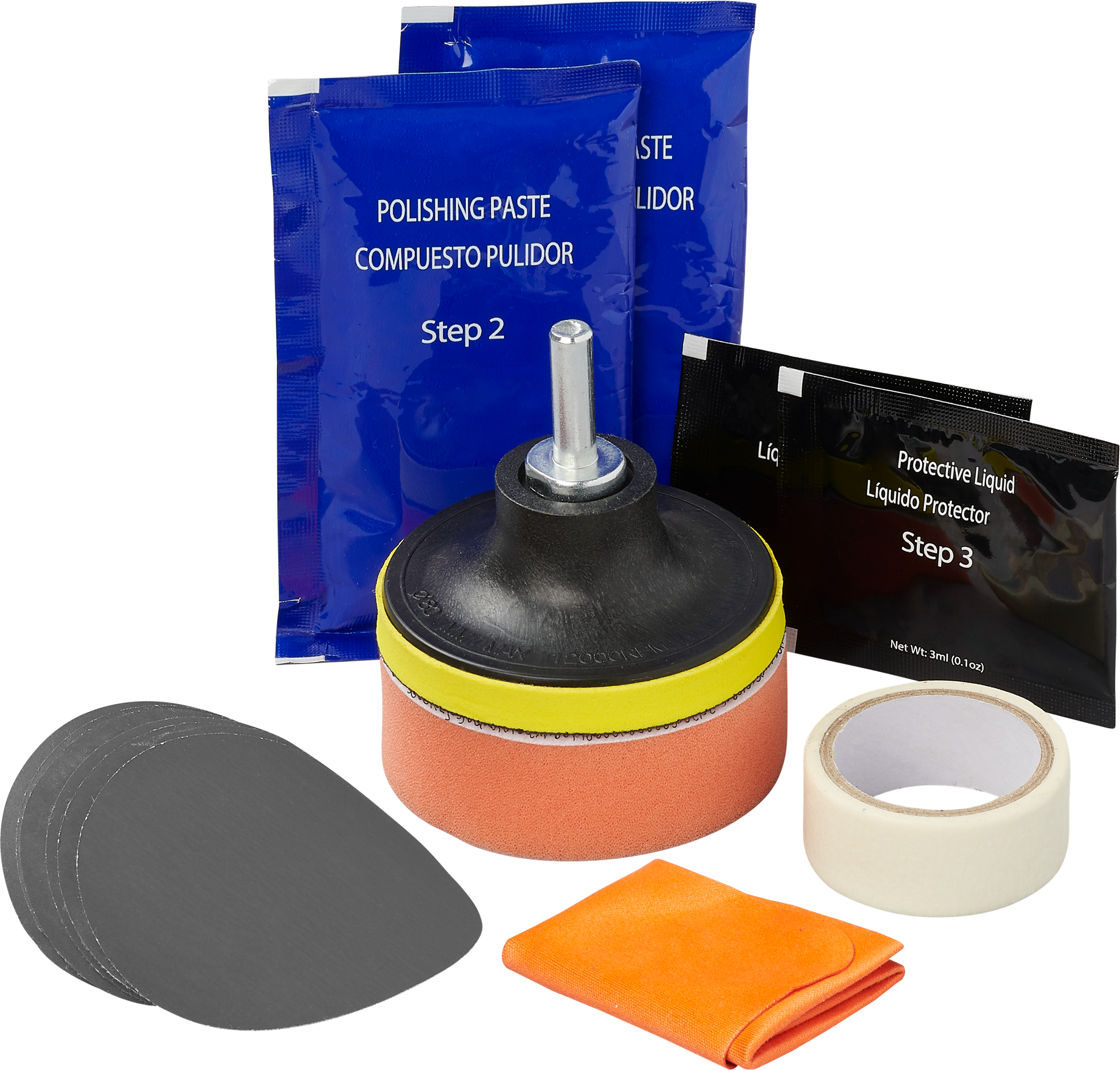 2. Polijsten Maak de oranje sponsschijf vast aan de houder en breng de polijstpasta aan. Polijst de lens tot de glans is hersteld naar nieuwstaat. Opmerking: Gebruik voor het beste resultaat een elektrische polijstmachine. Als u met de hand polijst, polijst dan met tenminste 200 ronddraaiende bewegingen met de klok mee.